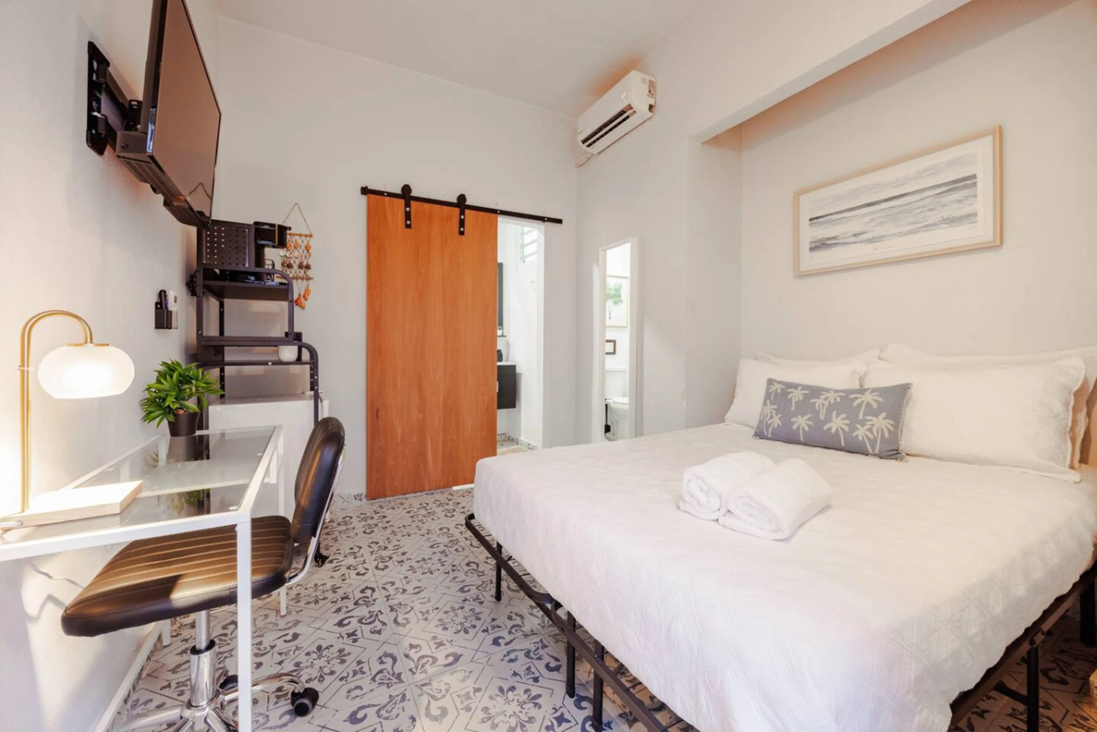 This private bedroom offers the perfect location in the heart of SJ. Featuring a full-size bed with fresh linens, air conditioning, and a smart TV for streaming your favorite shows. A dedicated work desk, coffee setup, and compact refrigerator make it easy to settle in. Enjoy our shared outdoor kitc...